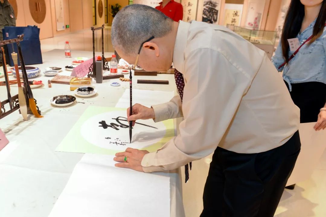 包装设计展厅内,十张大长桌一字排开,桌上摆好了纸墨笔砚,10余位著名书法家进行现场挥毫泼墨,吸引不少来宾前来围观欣赏。来宾们表示,现场看各位老师进行创作,更加震撼,每一幅优秀的作品,是成年累月的象征,一笔笔铿锵有力,不愧是书画家!